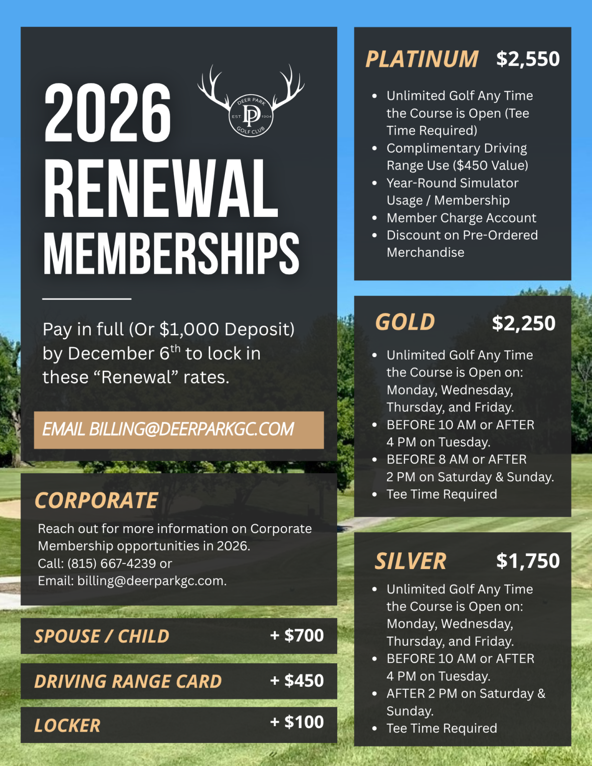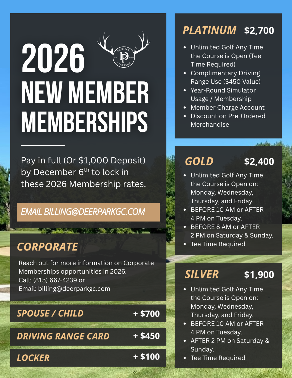 Deer Park Golf Membership Options Click here to download form Please enable JavaScript in your browser to complete this form.Member Contact Info Member Name: *FirstLastMember Spouse Name (if applicable): FirstLastMember Children’s Name (if applicable): Primary Mailing Address: *Address Line 1Address Line 2City— Select state —AlabamaAlaskaArizonaArkansasCaliforniaColoradoConnecticutDelawareDistrict of ColumbiaFloridaGeorgiaHawaiiIdahoIllinoisIndianaIowaKansasKentuckyLouisianaMaineMarylandMassachusettsMichiganMinnesotaMississippiMissouriMontanaNebraskaNevadaNew HampshireNew JerseyNew MexicoNew YorkNorth CarolinaNorth DakotaOhioOklahomaOregonPennsylvaniaRhode IslandSouth CarolinaSouth DakotaTennesseeTexasUtahVermontVirginiaWashingtonWest VirginiaWisconsinWyomingStateZip CodeMember #1 Cell: *Member #1 Email: *Member #2 Cell (If applicable) : Member #2 Email (If applicable): Membership #1 out Communication Consent We are happy to provide our members with the option to participate in our communication systems. Some of the features include the ability to receive: 1. Deer Park Course and Other Updates 2. Event Details and Signups 3. Participate in Surveys We use this information strictly for the purpose of communicating with you more efficiently. Our goal is to provide you with excellent communication as well as overall service and satisfaction. You may choose to discontinue your participation in our email and text communications at any time simply by clicking the “unsubscribe” link found at the bottom of each email, or by replying “STOP” to a text message from us. Please indicate below that you agree to allow us to use this information in providing you with services. Also, by checking the box below, you agree to adhere to Deer Park’s “Code of Conduct.” Any behavior that is deemed inappropriate could result in your membership being suspended and/or cancelled indefinitely. Please check the box below to indicate that you agree to allow us to use this information. *Agree to allow the use of this information.Date *Member *ExistingNewMembership Category: *Platinum Renewal Member $2,550Platinum New Member $2,700Gold Renewal Member $2,250Gold New Member $2,400Silver Renewal Member $1,750Silver New Member $1,900How did you find out about us? *I am a MemberReferred by a MemberWebsiteRadioSocial MediaReferred By:Submit